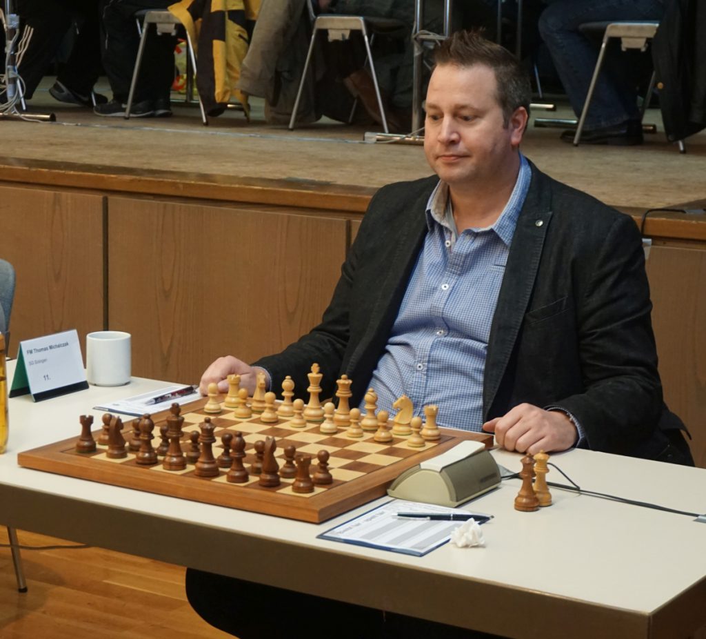 Für die Führung sorgte dann mit Thomas Michalczak ausgerechnet der Spieler, dem im bisherigen Saisonverlauf kaum etwas hatte gelingen wollen. Gegen das Jobava-System im Damenbauernspiel von FM Rudolf Meessen (2261) zeigte sich Tom mit Schwarz gut präpariert und gewann im Mittelspiel einen Bauern. In der Folge konnte er seine Position immer weiter verstärken und fuhr schließlich nach einem Figurengewinn nach etwa vier Stunden den Sieg ein. Die vermutlich matchentscheidende Szene spielte sich parallel am 2. Brett ab. Dort hatte Predrag Nikolic mit Weiß in einem Bogo-Inder gegen IM Thomas Koch (2473) den üblichen minimalen Positionsvorteil besessen, bevor er in der Zeitnotphase eine taktische Abwicklung übersah. Diese Chance ließ sich Thomas nicht entgehen und sorgte im Königsangriff für den Ausgleich.