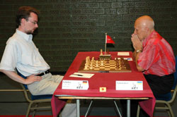 Dagegen sorgte Markus Schäfer für positive Schlagzeilen: Nach seinem Erfolg über den Chinesen Li Shilong (2540) erreichte er in packenden Kampfpartien zwei Punkteteilungen gegen die GM Sergej Erenburg (2585) und GM Vladimir Tukmakov (2560). Erst eine Niederlage gegen das große holländische Talent IM Wouter Spoelman (2456) beendete den kleinen Lauf unseres Zweitligaspielers. Nach einem Kurzremis gegen Wattenscheids IM Frank Holzke beendete Markus das Turnier mit 5 Zählern auf Platz 26 und gewann 15 Elo-Punkte.