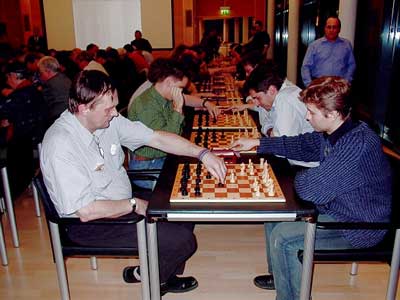 Sehr schade waren dann die freitäglichen Ereignisse aus Solinger Sicht, bei denen Alexander Naumann seinen bereits genommenen Urlaub kurzfristig gestrichen bekam (und fast auch noch die Bundesliga-Runde versäumt hätte) und vor allem wegen einer Organisationspanne das »Taxi Nikolic« mit vier ambitionierten jungen holländischen Blitz-Spielern erst die Reise antreten konnte, als in Essen bereits die erste Runde angepfiffen worden war. Somit wurden die Farben der Klingenstädter nur durch die Lokalmatadore Michael Hoffmann, Markus Schäfer und Bernd Schneider vertreten.