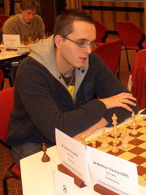 Doch die Aufregungen waren noch nicht vorbei, was inzwischen in Solingen niemanden verwundert, wenn Sipke Ernst noch aktiv ist. Unser »Spike« hatte in seiner Begegnung mit IM Matthias Thesing (2410) durch »kreative Spielführung« wieder einmal für einige Aufregung gesorgt. Nach Minusbauern in der Eröffnung und zwischenzeitlichem kapitalen Bauerneinsteller im Endspiel (den Thesing allerdings auch übersah), waren die Spieler schließlich in einem Endspiel gelandet, in dem Sipke mit Springer und Läufer gegen Springer und Bauer faktisch keine Gewinnaussichten besaß. Wenn allerdings überhaupt irgendjemand derartige Stellungen in unserer Mannschaft gewinnt, dann unser angehender niederländischer Großmeister: Unglaublicherweise stellte Thesing bei langsam knapp werdender Bedenkzeit in der Finishphase den Springer ein, ließ sich danach gar nicht mehr die Matt-Technik von Sipke zeigen, sondern saß nach dieser höchst bitteren Niederlage noch minutenlang fassungslos am Brett.