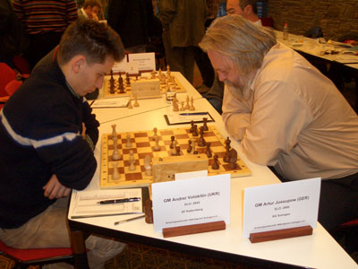 Dagegen nahm unsere Schwarz-Partie am Spitzenbrett einen bedeutend unangenehmeren Verlauf: Artur Jussupow hatte sich gegen die Blitz-Triumphator vom Vorabend, GM Andrei Volokitin (2645), wieder einmal auf die französische Winawer-Variante eingelassen, die er bereits beim Match der Generationen in Amsterdam ausgiebigst gegen die junge Generation getestet hatte. Leider erinnerte der Partieverlauf eher an seinen dortigen Verlust gegen Karjakin, als an die erfolgreichen Versuche. Dessen Landsmann Volokitin setzte unseren Routinier mit kraftvollem Schach immer schwerwiegender unter Druck, so dass die Essener dank dieser exzellenten Partie den verdienten Ausgleich erzielen konnte. Kurz danach ging Katernberg sogar unerwartet in Führung: Predrag Nikolic hatte mit Weiß gegen GM Alexander Motylev (2662) nach ruhiger Eröffnung die gewohnten positionellen Daumenschrauben angelegt, so dass der Russe schwer um das Remis zu kämpfen schien, als unser so zuverlässiger Bosnier in Motylevs Zeitnot völlig unerwartet eine Qualität einstellte, wonach die Partie nicht mehr zu retten war.
