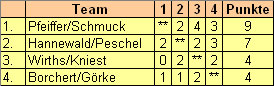 Das Tandem-Turnier ging bei mäßiger Beteiligung aber hervorragender Laune aller Teilnehmer über die Bühne. Dabei machte das Team Michael Pfeiffer & Markus Schmuck seine Titelambitionen gleich in der ersten Runde klar, als sie das Team Clara Wirths & Olli Kniest mit 4:0 deklassierte. Aber auch Anton Hannewald & Andreas Peschel setzten sich mit 3:1 souverän gegen Stephan Borchert & Joachim Görke durch. Eine Vorentscheidung brachte die zweite Runde, als Hannewald/Peschel gegen Wirths/Kniest nur ein 2:2 erreichten, während Pfeiffer/Schmuck ein klares 3:1 gegen Borchert/Görke erzielten. So reichte Pfeiffer/Schmuck in der letzten Runde ein 2:2 gegen die unmittelbaren Konkurrenten Hannewald/Peschel, um den Gesamtsieg sicherzustellen; auch Wirths/Kniest und Borchert/Görke trennten sich unentschieden.