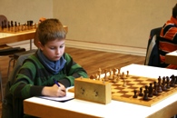 Leider musste die von den Schachfreunden Uli Kalkum und Philipp Müller betreute X. Mannschaft in der 3. Bezirksklasse bei der V. des BSW Wuppertal mit nur vier Spielern antreten. Da auch Wuppertal nur fünf Bretter besetzen konnte, wurde das letzte Brett frei gelassen. Seine erste »Senioren«-Turnierpartie bestritt dabei Jan-Luca Bartsch (Bild). Vom freundlichen Gegner in das Wesen der Schachnotation eingewiesen und an die Regel erinnert, nicht jeden Zug auch noch flüsternd zu kommentieren, hatte dessen Rücksicht auf den Youngster dann aber doch Grenzen. Nach 25 Zügen endete das ungleiche Duell mit einem Matt. Thorben Voigt, Samstag noch auf dem Kunstrasen für den »Club« hinter dem Ball her, erstürmte die Stellung seines Gegners, nahm ihm erst eine, dann zwei, dann drei Figuren ab und setzte schließlich matt. In der nun entscheidenden Phase gab Alexander Fuchs seine Weiß-Partie remis. Nach einer verdorbenen spanischen Eröffnung geriet er mächtig unter Druck, ohne dass der Gegner seinen Königsangriff in einen vollen Punkt ummünzen konnte. Das tat in der letzten laufenden Partie dann Philipp Andrä: In der sicher schachlich besten Partie baute Philipp nach der Eröffnung kontinuierlich einen Fianchetto-Angriff vom Damenflügel auf die weiße Königsstellung auf. Dann nahm Philipp den weißen Figuren die Luft, gruppierte das eigene Angriffsmaterial schulmäßig um, tauschte letzte Störenfriede ab und setzte schließlich im sauber vorgetragen Schlussangriff den Gegner matt. Mit dem 2½:2½ bleibt das Youngsterteam ungeschlagen aber auch noch ohne Sieg.
