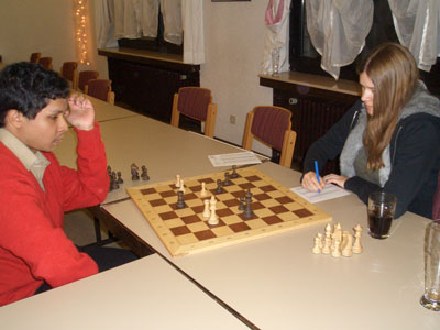 Nach 3 Stunden Spielzeit hatten sich die Reihen gelichtet und fast alle übrigen Spieler ihre Partien aufgeben müssen. Es lief nur noch die Partie von Clara Wirths, die sich ein Turmendspiel mit Mehrbauern erarbeitet hatte (Bild oben). Das Finale dieser letzten Begegnung zog noch zahlreiche Zuschauer in ihren Bann, denn ihr Ende zog sich noch fast eine Stunde hin! Auch in der unangenehmen Situation, nun stets relativ schnell ziehen zu müssen, spielte Clara kompromißlos auf Gewinn und wich selbst dann noch dem Remis aus, als es bereits mit großen Risiken für sie verbunden war. So kreierte Sandipan immer größere Gegenchancen und konnte nach dem finalen Fehler von Clara schließlich nach 110 Zügen sogar einen mehr als glücklichen Sieg verbuchen.