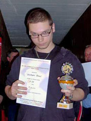 U20-Stadtmeister wurde in dem mit dem der U18 zusammengelegten Turnier mit 4 ½ /5 Christopher Blomel (Bild) vor David Möller, der im direkten Duell in der qualitativ sicherlich besten Partie des Tages unterlag. David kam mit 3 Punkten ein und landete damit auch vor dem neuen U18-Stadtmeister Tobias Leuther, der es auf 3 Zähler brachte, gegen U18-Favorit Anton Hannewald remisierte und den Turniersieg durch einen Schlussrunden-Erfolg über David sicherstellte. Auch Alexander Kirschbaum und Alexander Fuchs (beide je 1 Punkt) spielten ansprechendes Schach.