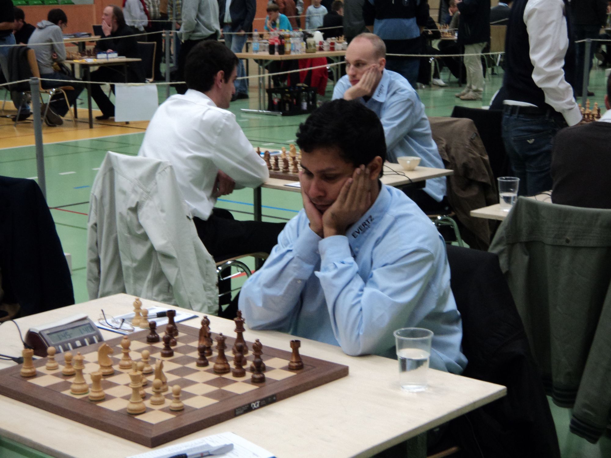 Unser Bundesliga-Team hat mit einem unerwartet hohen 5½: 2½ das Spitzenspiel gegen den SC Eppingen gewonnen und sich damit erst einmal in den oberen Tabellenregionen festgesetzt. Das klare Ergebnis täuscht allerdings über den Kampfverlauf hinweg, in dem sich die beiden letztjährigen Tabellennachbarn ein extrem enges Match boten, das alles bereit hielt, was Bundesliga-Schach so spannend macht. Vor der Zeitkontrolle waren dabei vor allem Sandipan Chanda und Predrag Nikolic mit Fortuna im Bunde, als sie jeweils mit den weißen Steinen gegen Ferenc Berkes (2706) und Falko Bindrich (2548) zwischenzeitlich klar auf Verlust standen. Doch in der Zeitnotphase wendete sich das Blatt und beide konnten später ihre leicht besseren Stellungen noch zum Sieg führen, bevor Jan Smeets mit den schwarzen Steinen in der vielleicht besten Partie des Kampfes gegen Viorel Bologan den krönenden Schlusspunkt setzte.