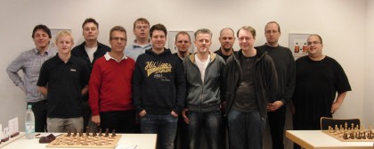 Karsten Keller, Klaus Schroer, Jan Eric Chilla, Johannes Westermann, Martin Villwock, NRW-Meister IM Christian Braun, FM Oliver Kniest, René Tückmantel, Michael Meinhardt, Thomas Füllgrabe, Oliver Albrecht und Marcus Schmücker (v.l.n.r.) (Klick aufs Bild öffnet größere Version)