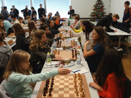 Vor der Schlussrunde liegt unsere U14w mit 12:0 Zählern vor den Schachpinguinen Berlin (10:2). Damit genügt morgen ein Unentschieden, um den Traum vom Deutschen Meistertitel perfekt zu machen. Allerdings steht in der Schlussrunde das stets extrem umkämpfte Niederrhein-Derby gegen den Ausrichter Düsseldorfer SK auf dem Programm.