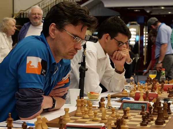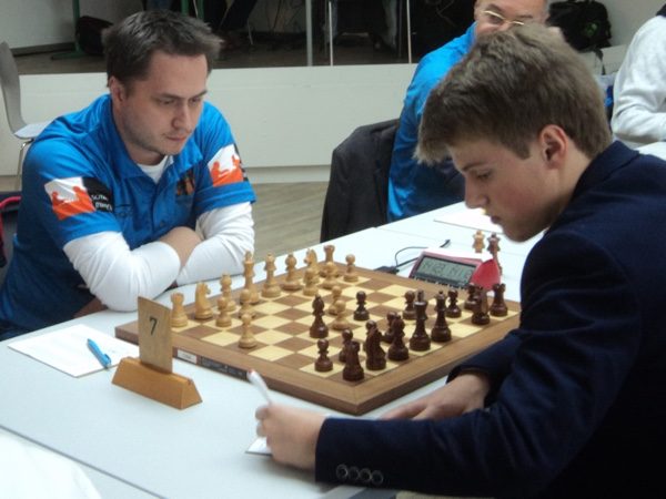Die Bekanntgabe der Aufstellungen zeigte, dass die Kieler bei ihrer Bundesliga-Premiere auf ihre vier polnischen Großmeister im Kader verzichten mussten, so dass wir als klarer Favorit in die Begegnung gingen. Nach knapp 3 Stunden gab es die erste Punkteteilung zu verzeichnen: Borki Predojevic hatte mit Weiß gegen die Caro-Kann-Verteidigung des dänischen GM Allan Stig Rasmussen (2543) die aktuelle Mode-Abtauschvariante gewählt und die schwarze Bauernstruktur zersplitten können. Als der Däne jedoch trotz eigener langer Rochade mutig mit seiner Dame den Bauern auf b2 einkassierte, fand Borki trotz langem Brütens keinen vielversprechenden Angriff und forcierte das Remis durch Zugwiederholung.
