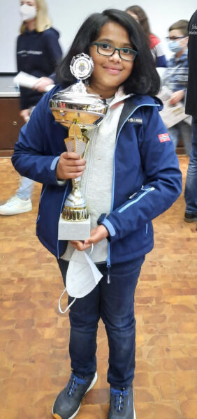 Mit dabei war auch unser Jungtalent Diya Dhanasekaran Meenambigai. Die 10jährige spielte ein starkes Turnier, holte vier Siege und ein Unentschieden und landete mit 4½/7 auf dem 18. Gesamtrang. Dafür wurde sie als beste Spielerin in der Altersklasse U12w ausgezeichnet und durfte sich über einen überdimensionalen Pokal freuen.