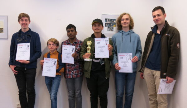 Das spannendste Turnier gab es in der U18, in der 6 Spieler ein Rundenturnier austrugen. Hinter dem souveränen Bezirksmeister Dominik Hirsch (ESG), der nur zwei Remisen gegen seinen Vereinskollegen Hendrik Mordos und Kian Scheidtmann abgab, landeten diese beiden zusammen mit Max Pernizki auf dem geteilten 2.–4. Rang mit jeweils 3/5. Nach der Sonneborn-Berger-Wertung hatte Mordos die Nase knapp vorn, während Kian Scheidtmann sich über den letzten Qualifikationsplatz für die Niederrheinmeisterschaft freuen konnte. Max Pernizki darf aber nach seiner starken Meisterschaftspremiere auf einen Nachrückerplatz für die Verbandsebene hoffen.