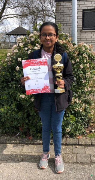Dank einer famosen Schlussrunde haben sich mit Shreyas Shivkumar (U10), Diya Dhanasekaran Meenambigai (U12w) und Sarah Fetahovic (U16w) gleich drei unserer Talente jeweils den zweiten Platz bei den NRW-Einzelmeisterschaften in ihrer Altersklasse gesichert und werden damit alle Ende Mai zum ersten Mal in ihren noch jungen Schachkarrieren bei den Deutschen Jugendeinzelmeisterschaften in Willingen dabei sein können. Die größte Überraschung gelang dabei Shreyas, der den bereits vor der Schlussrunde als NRW-Meister feststehenden und fast 400 DWZ-Punkte mehr aufweisenden David Teng vom Düsseldorfer SV bezwingen konnte.