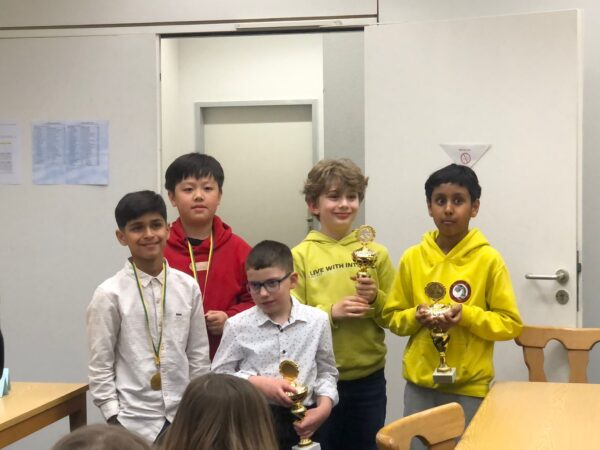 Die Preisträger der NRW-U10-EM (v.l.): Shreyas Shivkumar, Yichen Liu, Jad Besou, Konstantin Müller, Turniersieger Dakxwin Sutharjan