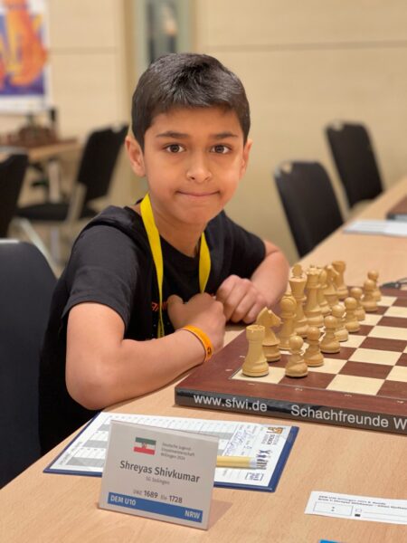 Gleiches gilt ohne Zweifel für Shreyas Shivkumar, der mit 6½/11 die Top Ten als Zwölfter in der U10 nur ganz knapp verpasste. Shreyas hatte sich nach einem hart umkämpften Remis in der 8. Runde gegen Tino Sander (1724) mit einem erfolgreichen Mattangriff gegen Kilian Kjulbassanoff (1411) noch weiter nach vorne gespielt. In der zweiten Partie des gestrigen Tages verpasste er dann gegen Sepas Zargaran (1810) den Sieg. Ein voller Zähler in der Schlussrunde gegen Toshiya Aguike (1786) hätte für Shreyas den fünften Platz bedeutet, doch in einer wilden Partie erwies sich schließlich seine Königsstellung als zu unsicher. Trotz dieser etwas unglücklichen Schlussrunde zeigte der 10jährige sein großes Potential, weil er mindestens zwei Siege noch durch zu schnelle und impulsive Züge verschenkte.