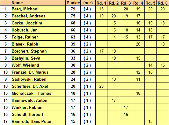 | Nr. | Teilnehmer | 1 | 2 | 3 | 4 | 5 | 6 | Punkte | SoBerg |