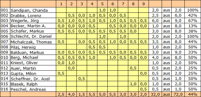 | 10. | SV Wattenscheid II | 1 | 1½ | 3½ | 2½ | 2 | 2½ | 3½ | 5½ | 1½ | ** | 2 – 16 | 23.5 | ||