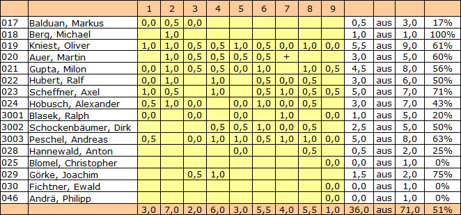 | 8. | Düsseldorfer SK | 1½ | 3½ | 2½ | 1½ | 2½ | 4 | 3½ | ** | 5 | 5 | 5 – 13 | 29.0 | ||