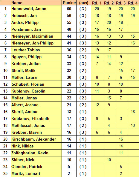 | 12. | Nguyen, Philipp | 4W0 | 9S1 | 15W1 | 10S0 | 14W1 | 2S0 | 6W0 | 3.0 | 26.5 | 9.00 |