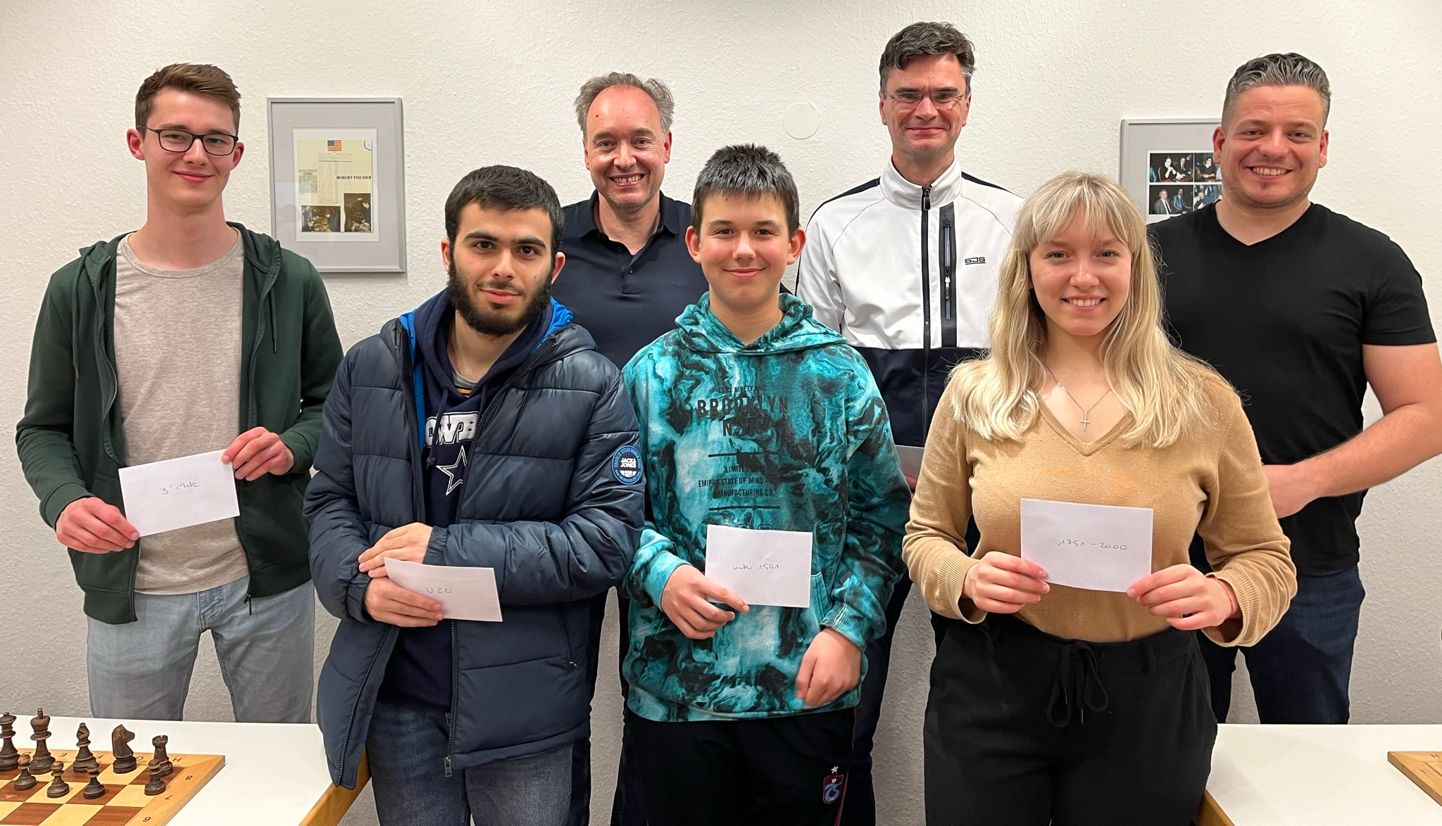 Blitz-ch-2023 13. Mai 2023 2048 × 1174 Blitz-ch-2023 Die Gewinner: FM Timo Küppers, Idris Asadzade, FM Michael Berg, Atar Efecan, Stadtmeister GM Loek van Wely, Luisa Bashylina und Semir Nurovic (v.l.n.r.)