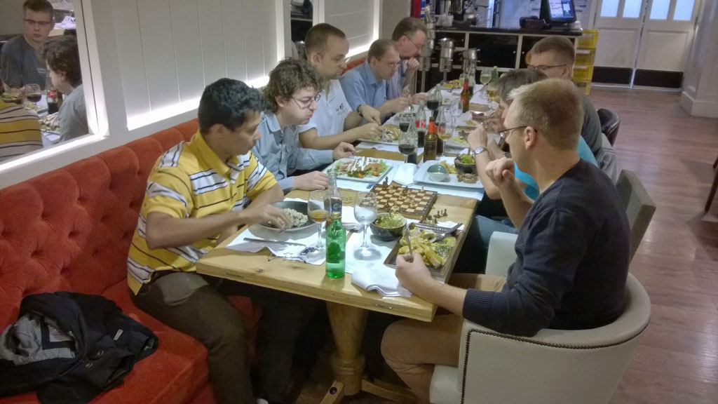 Vor der heutigen Runde erhielten einige SG-Spieler von einem der Schiedsrichter das Kompliment, das wir bereits jetzt das »best dressed team« seien. Beim Europapokal kommen nämlich erstmals die neuen Trikots zum Einsatz, die in einem kräftigen Blau mit den Logos des neuen Sponsors Forst, unserer Schachgesellschaft und der Schachbundesliga fast ein wenig an Fußball-Trikots erinnern.
